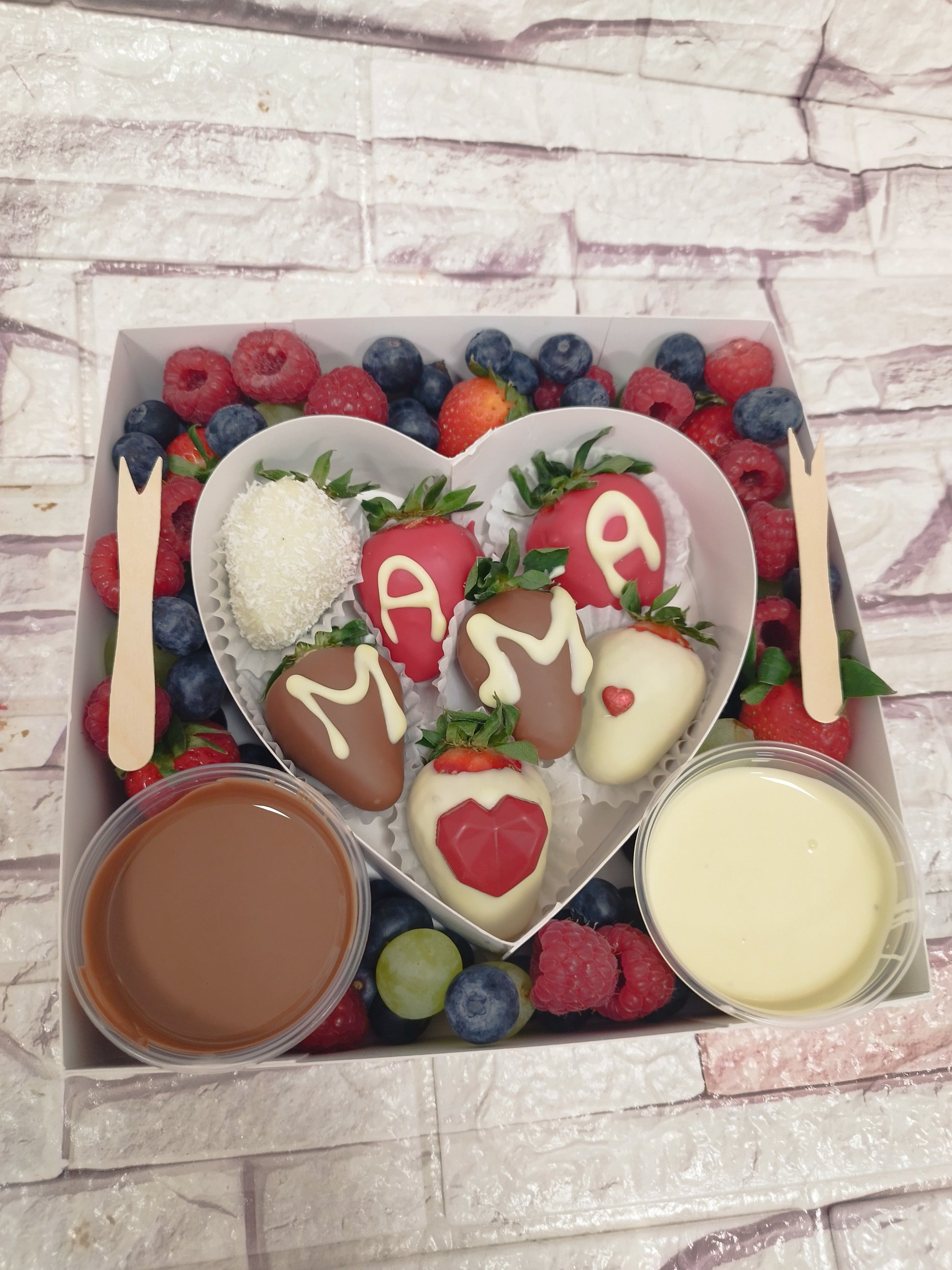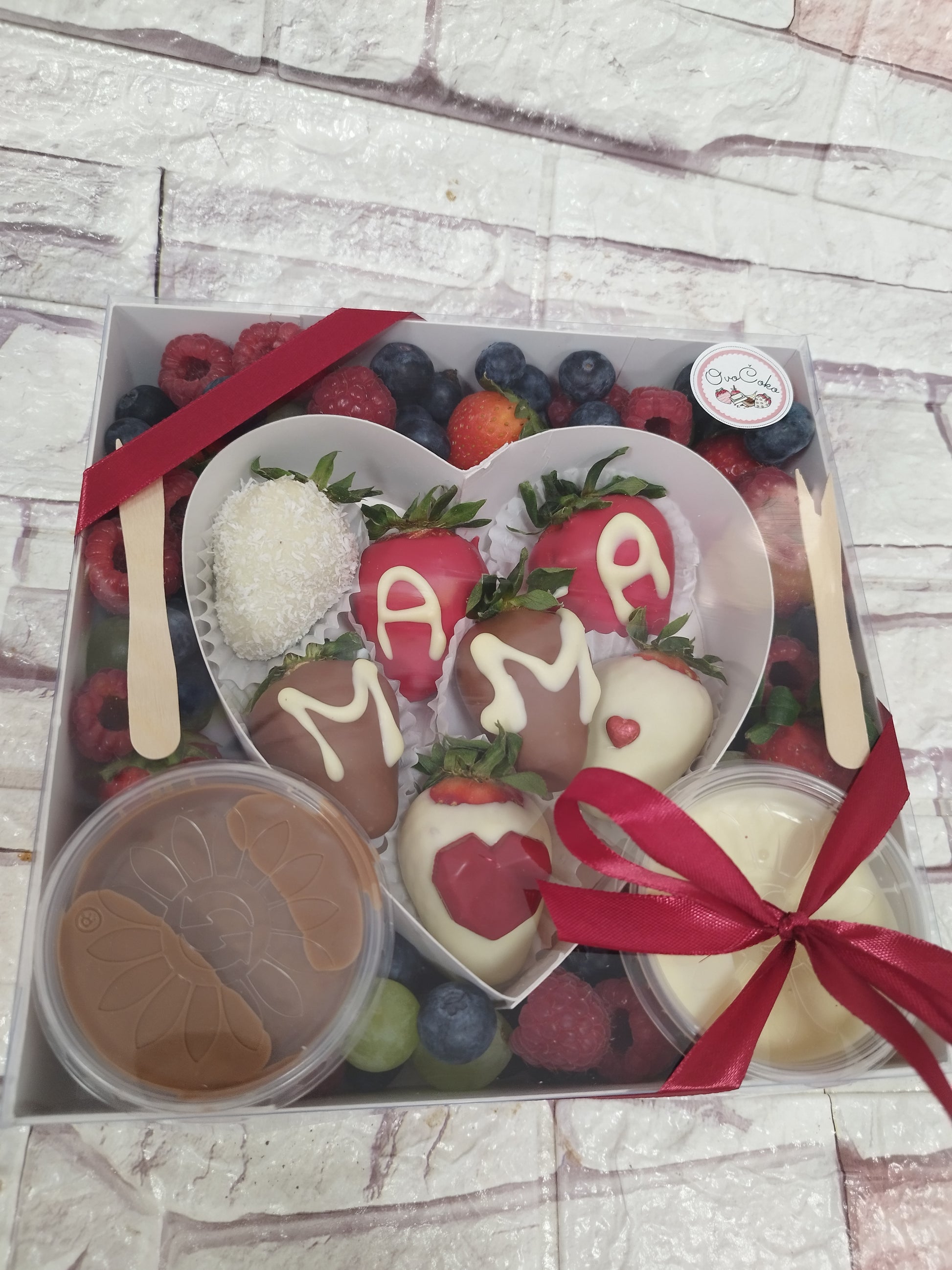 Krabička s jahodami v belgickej čokoláde v kombinácii s drobným ovocím s možnosťou namáčania si do teplej belgickej čokolády vami ohriatou pri konzume(návod súčasťou),mašľa je samozrejmosťou darčekového balenia.