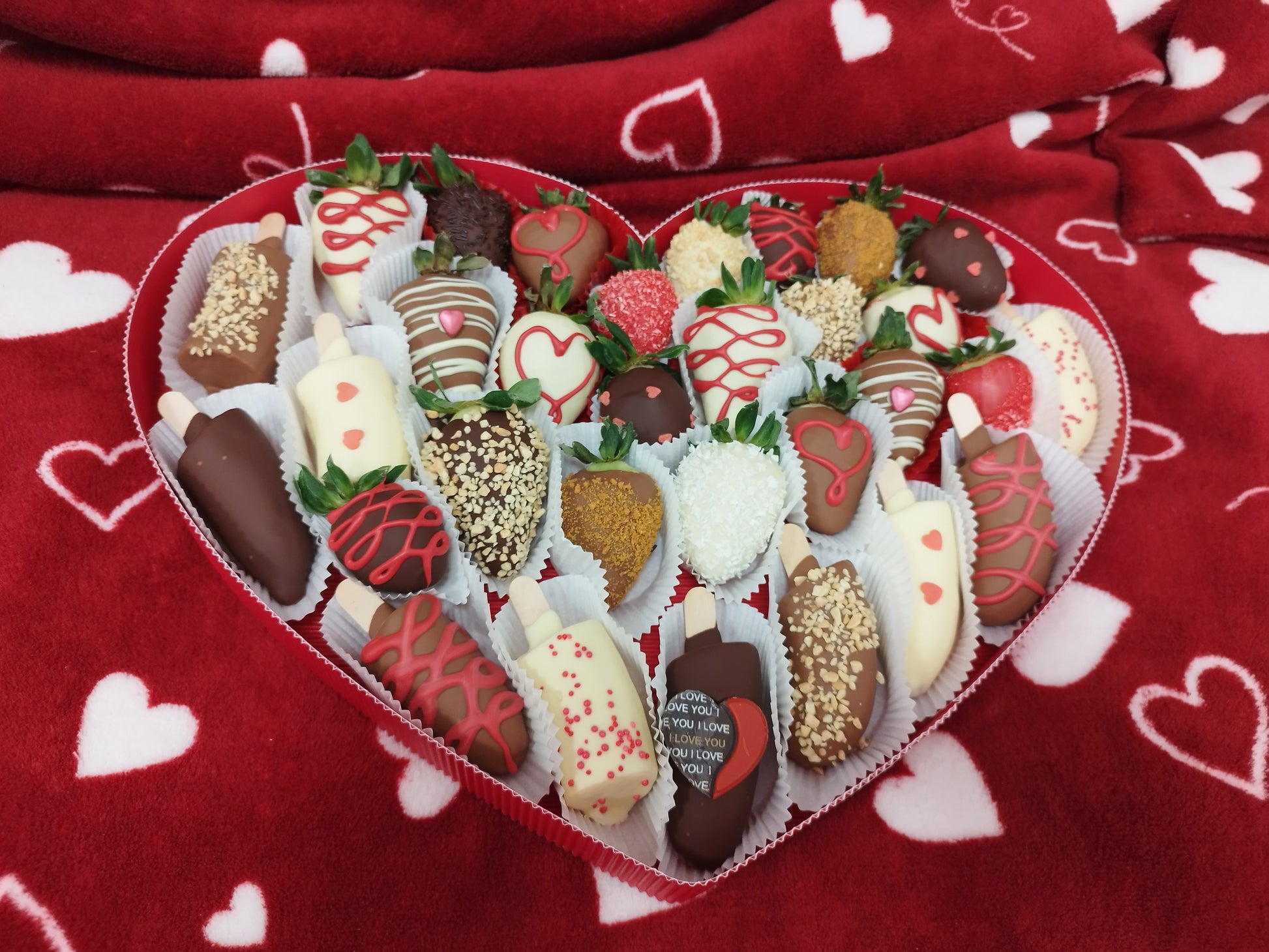Podnos v tvare srdca z čerstvých jahôdok a banánov